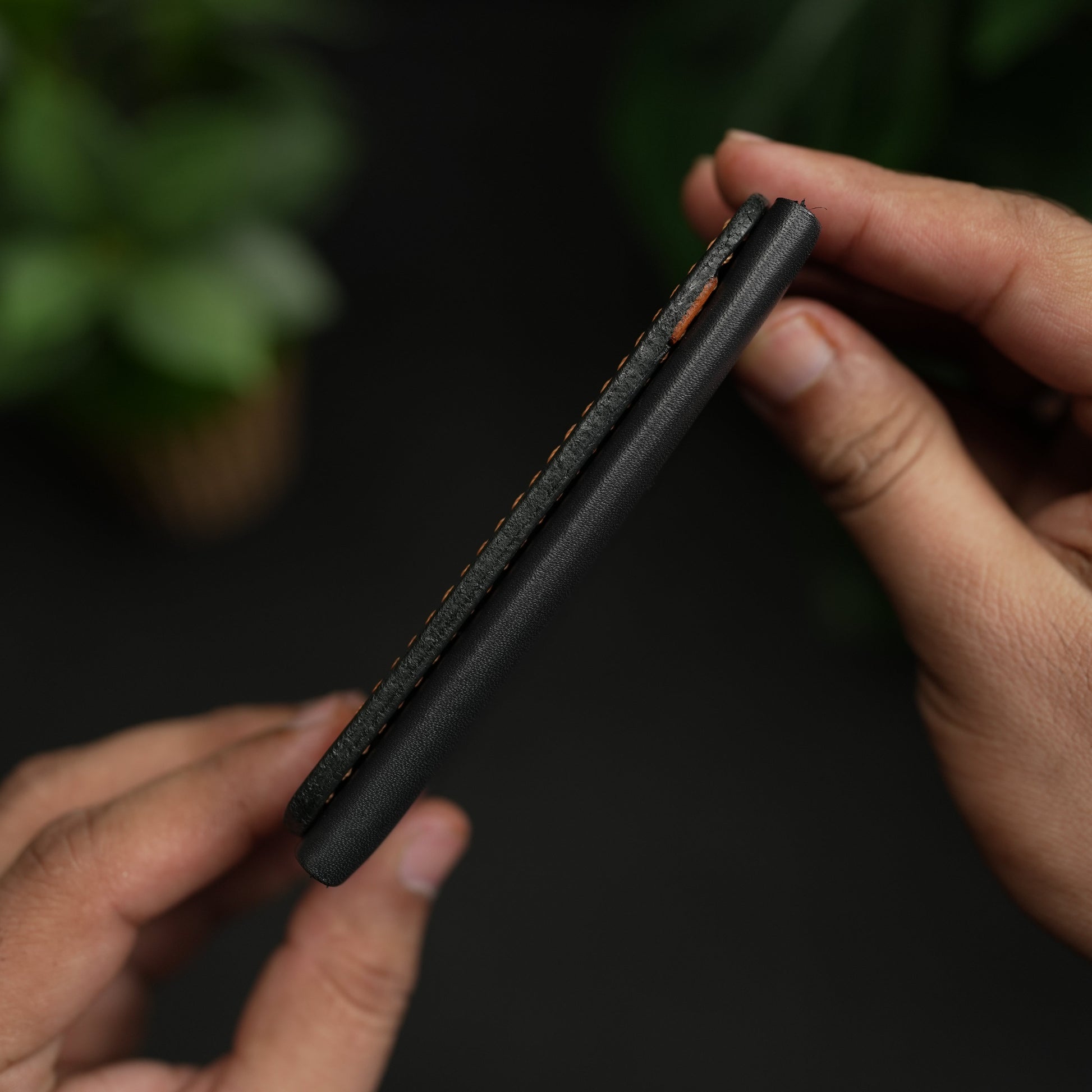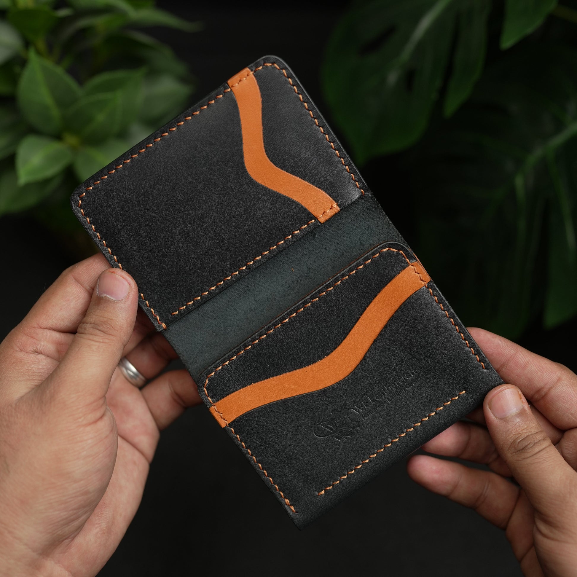 Designed with a sleek black and tan combination, the wallet features elegant tawny hand stitching, giving it a refined yet minimalist appearance. Compact in size yet highly practical, it includes two vertical card slots and one hidden slot on the left, complemented by two horizontal card slots and a cash pocket on the right. Measuring 4.25” x 3.25”, it easily fits in your pocket without adding bulk — a perfect gent's wallet for daily use.