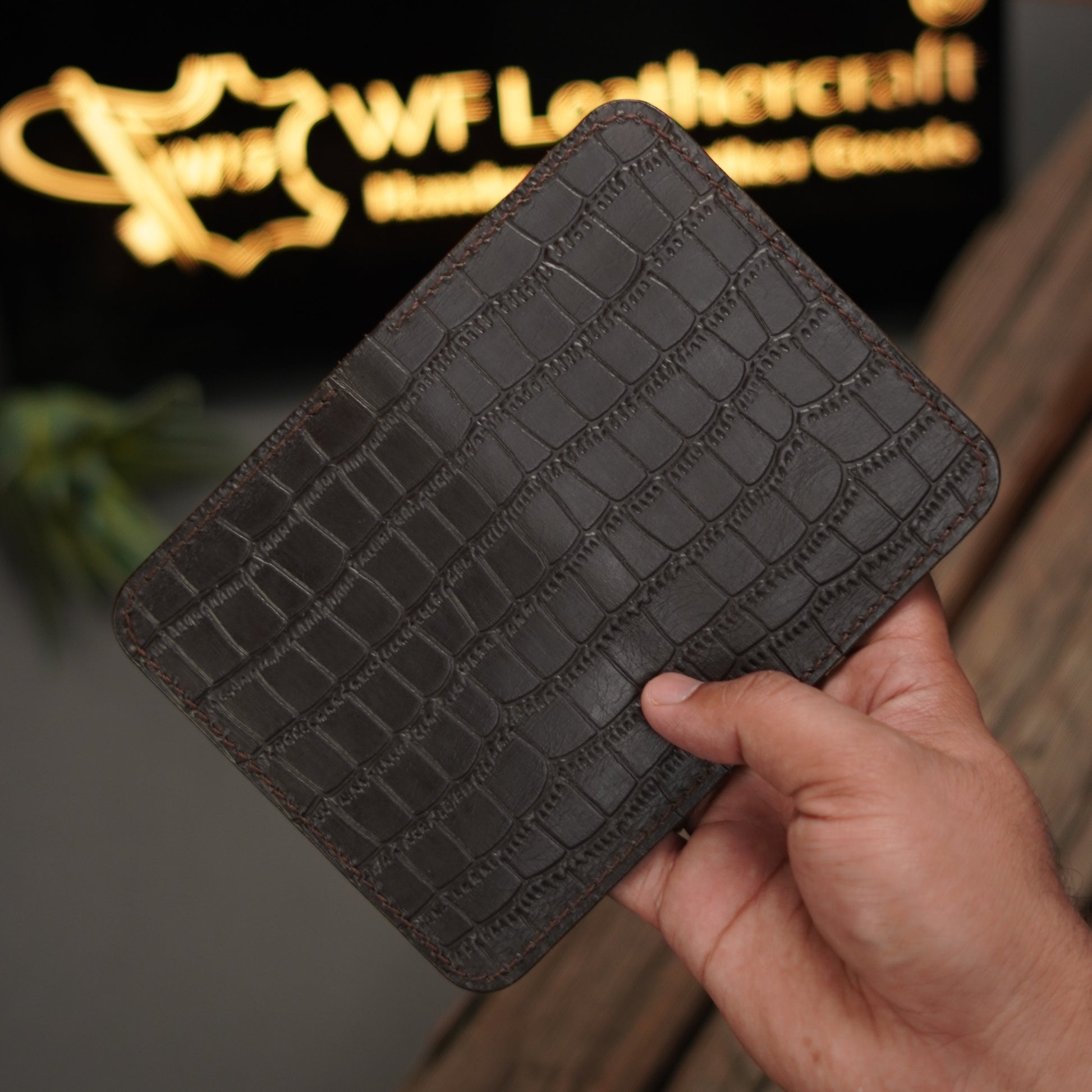 Introducing the No. 79 Vertical Wallet, designed for the minimalist with an eye for style. Its sleek Brown crocodile exterior, complemented by a tasteful mix of plain brown on the inside, exudes elegance. Open it up, and you'll find convenient card pockets on both sides at the front, seamlessly followed by spacious compartments for cash and receipts. Crafted from the finest 100% full-grain chrome-tanned leather, this wallet is not just an accessory; it's a timeless investment destined to stay by your side for many years.