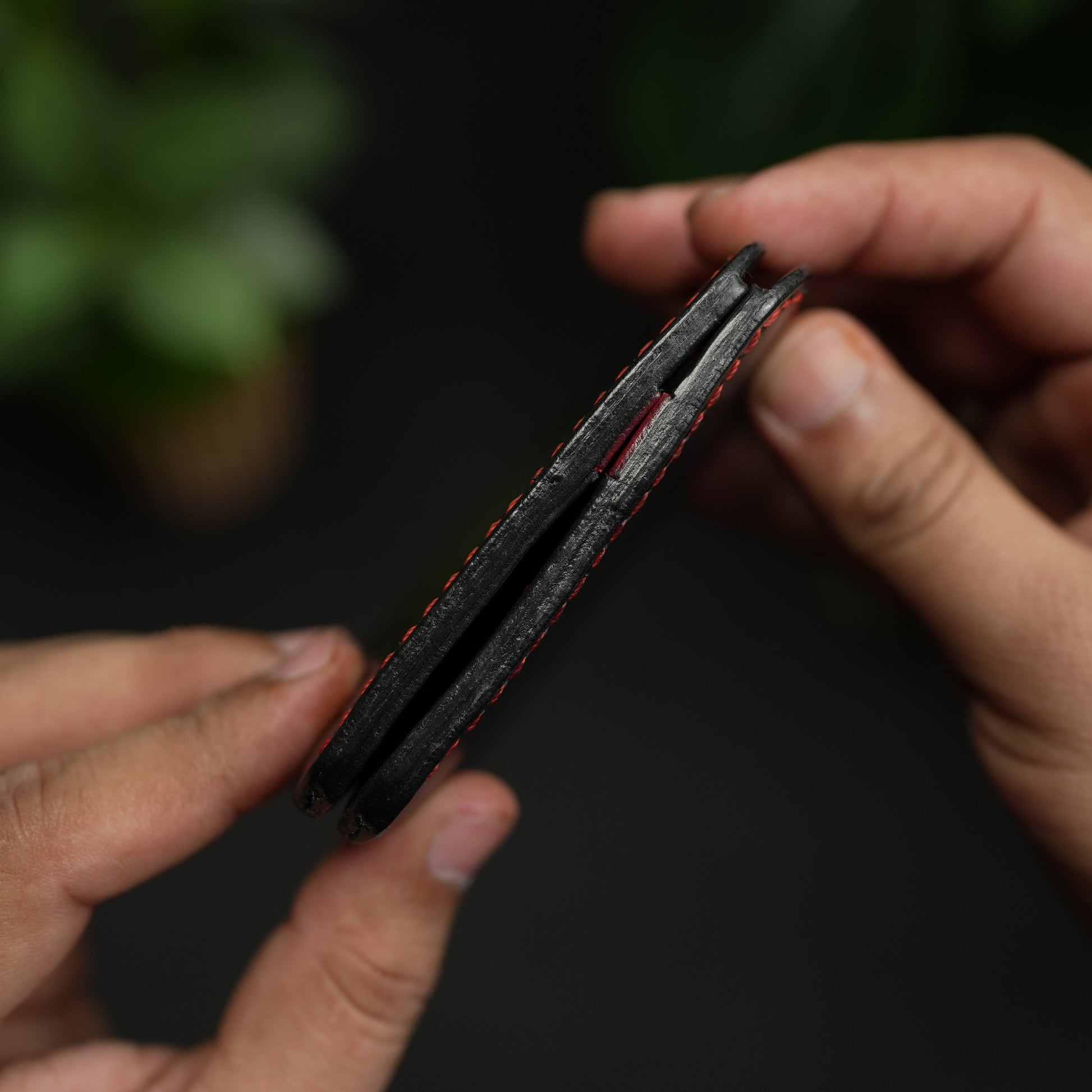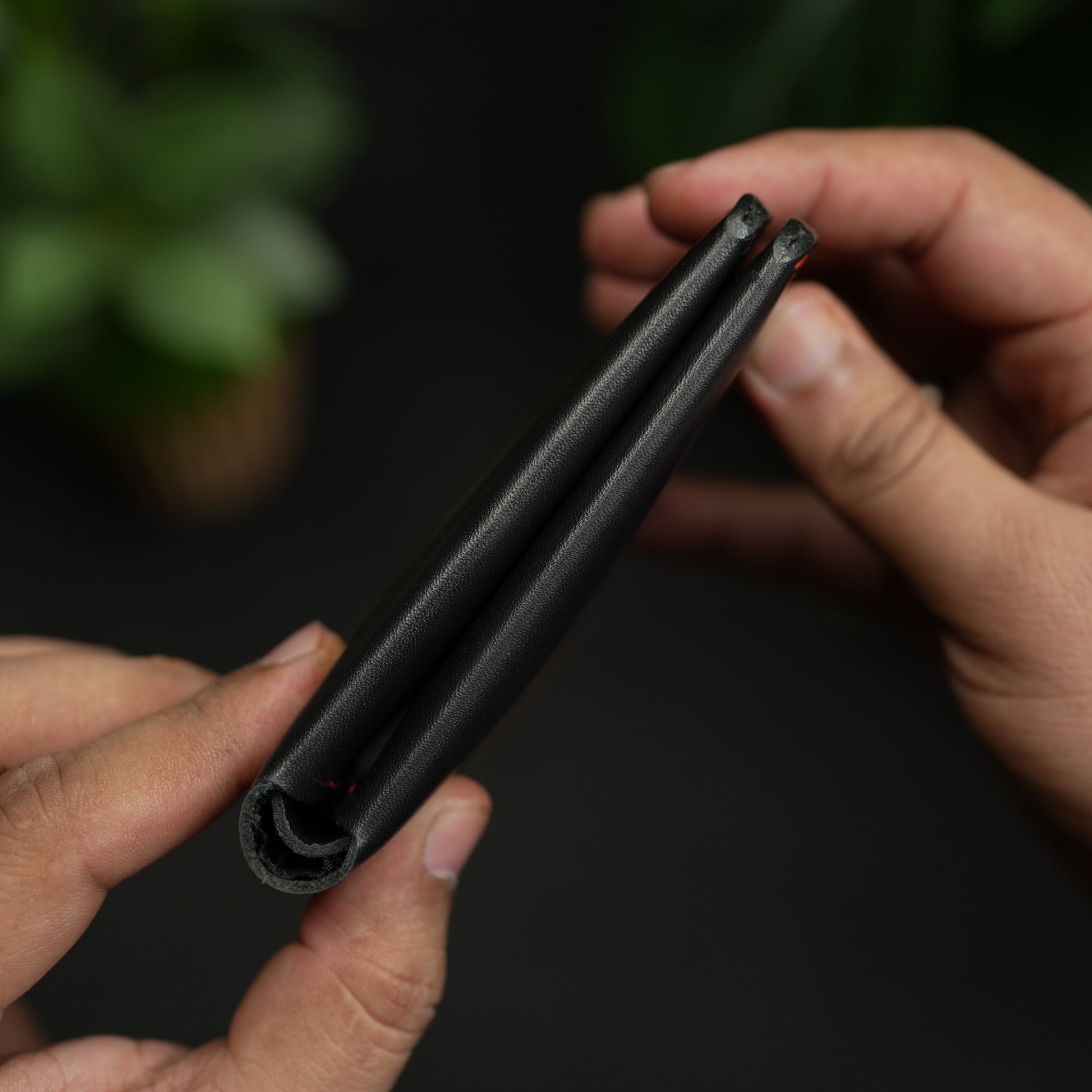 The bifold wallet features a sleek black exterior with bold red interior accents — a perfect mix of tradition and modern craftsmanship. Each piece is 100% handcrafted using Japanese bonded nylon thread for French-style stitching, ensuring long-lasting strength and beauty. The edges are burnished and finished with Fiebing’s Edge Cote for a smooth, professional look.