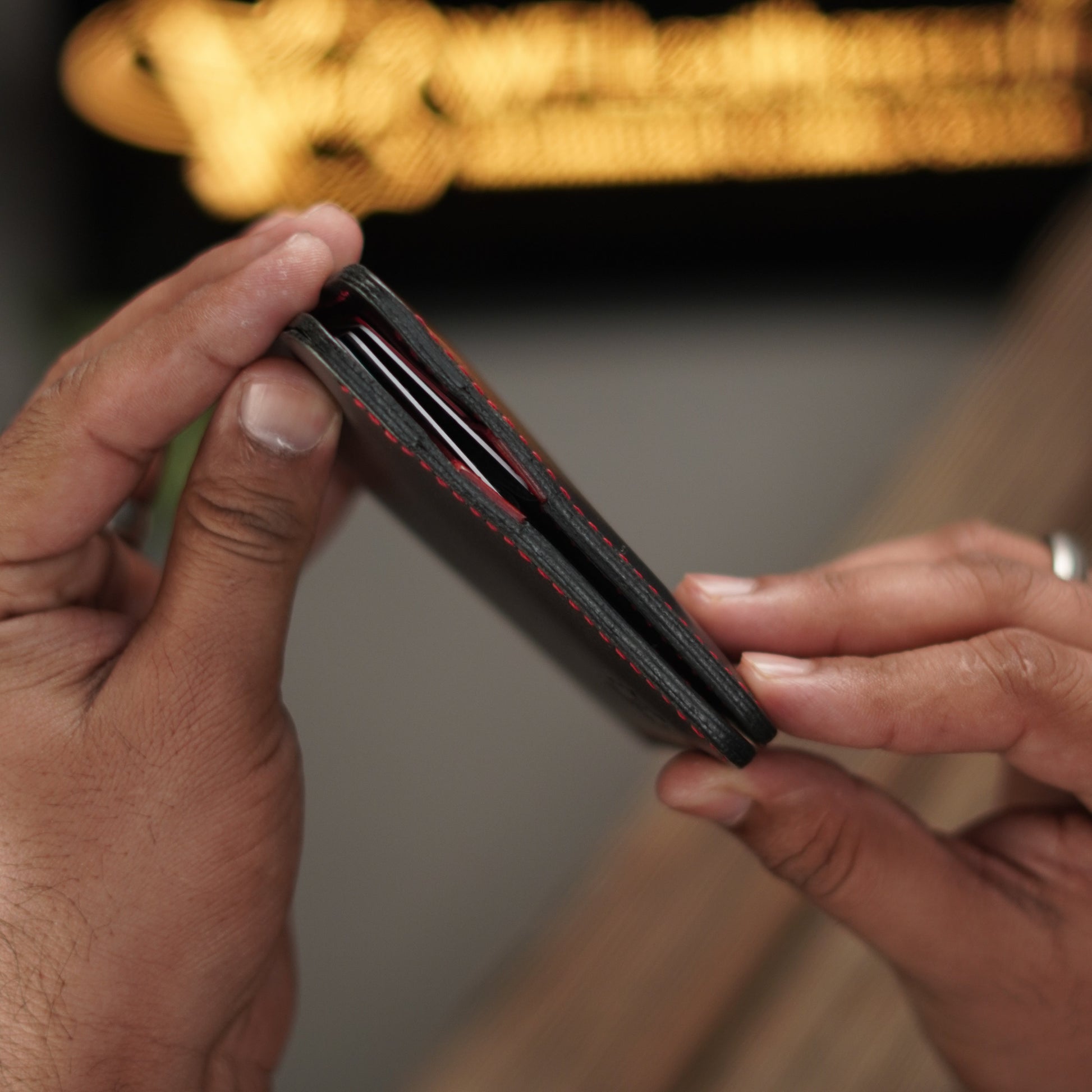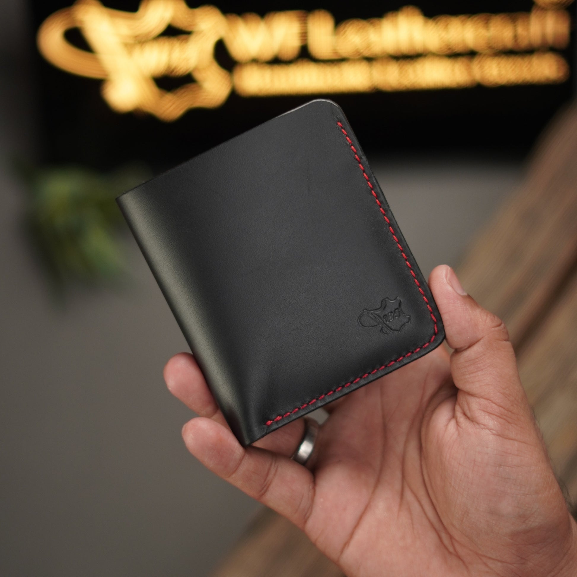 Elevate your style with the No.86 Vertical Bifold Leather Wallet in Black and Red color . Crafted from full-grain cow leather, this wallet boasts a vegetable-tan finish for a luxurious touch. The French-style stitching, using premium bonded nylon thread imported from Japan, ensures durability and sophistication.