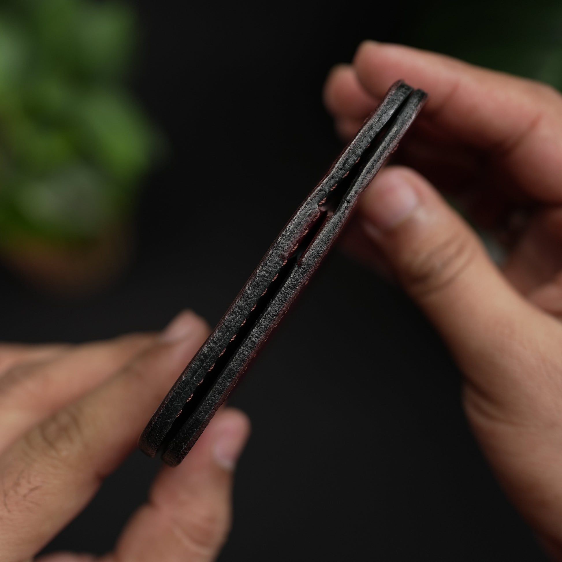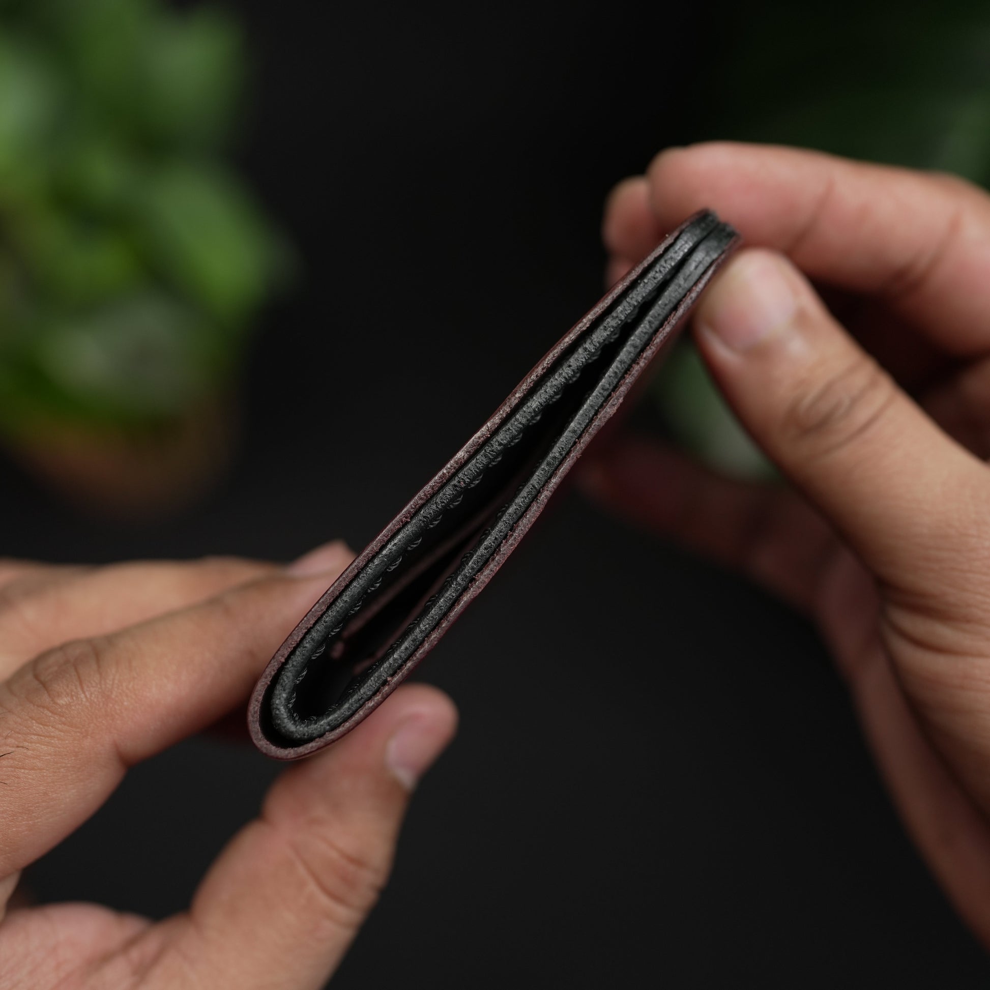 Finished in black and burgundy leather, this fold-over leather wallet offers sophistication with durability. Each piece is hand-stitched using French-style stitching and bonded nylon thread imported from Japan, ensuring long-lasting strength and smooth finishing.