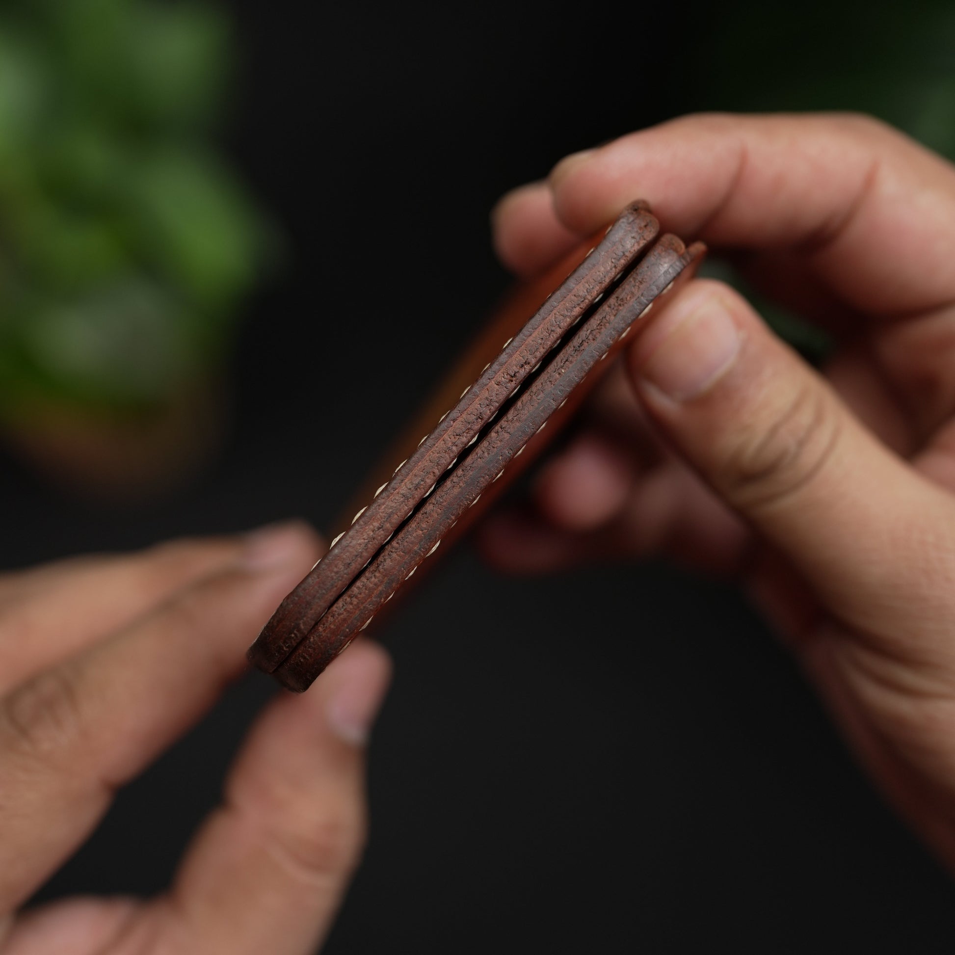 Introducing the No.98 Handmade Bifold Leather Wallet in a rich British tan shade — a true blend of craftsmanship and durability. Made from 100% full-grain cow leather, this slim wallet (4.25” x 3.10”) fits perfectly in your pocket. Each piece is hand-stitched with diamond-style precision, reflecting genuine artistry and strength. Designed for modern gentlemen, it includes two card slots that hold up to 10 cards, a spacious billfold, and a convenient thumbhole for easy card access.